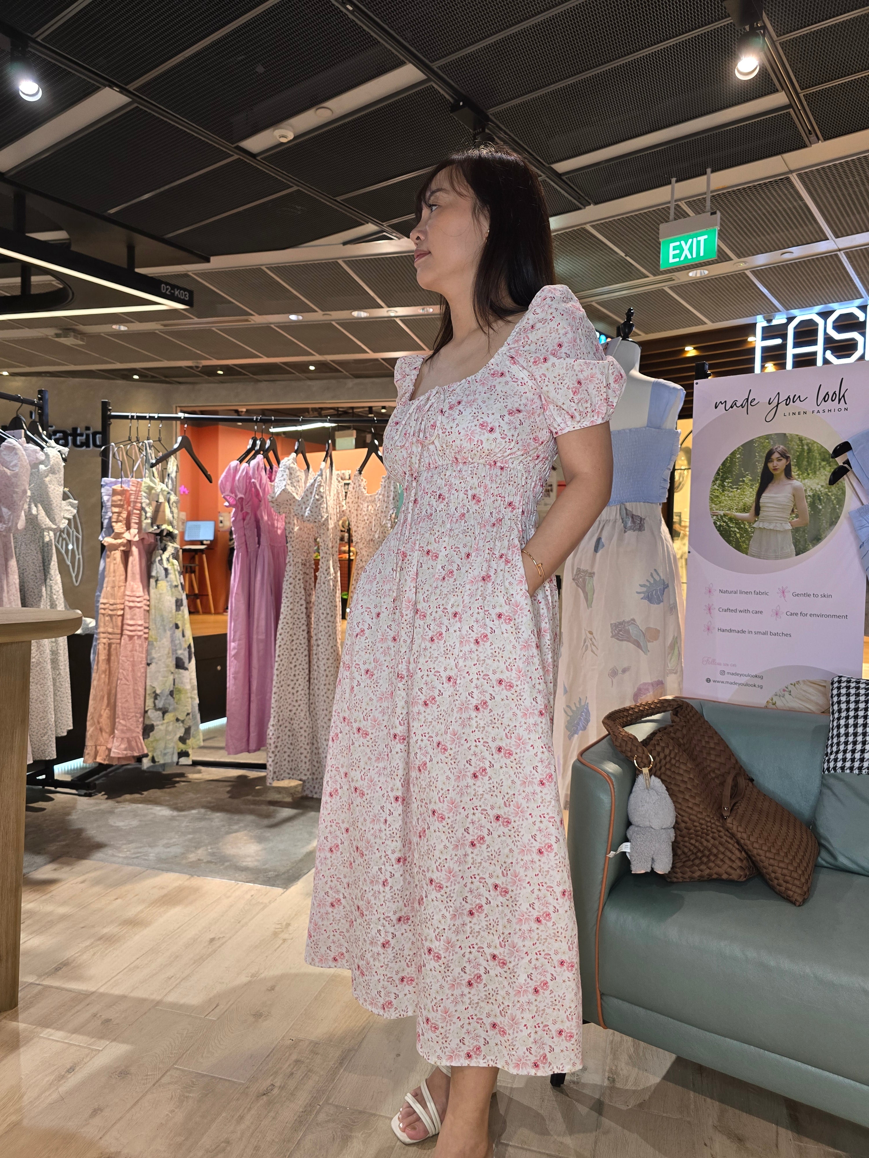 Designed with a sweetheart neckline and puffed short sleeves, this feminine silhouette is both flattering and comfortable. The ruched bodice hugs the waist before flowing into a gently flared skirt with hidden side pockets for ease.