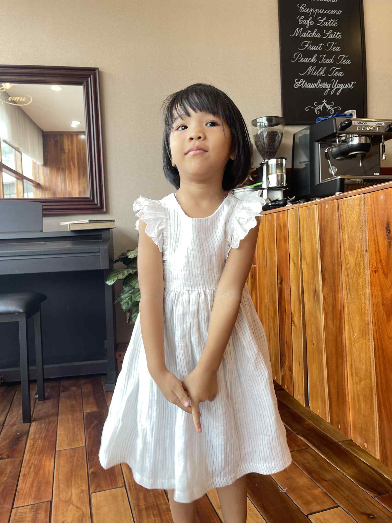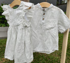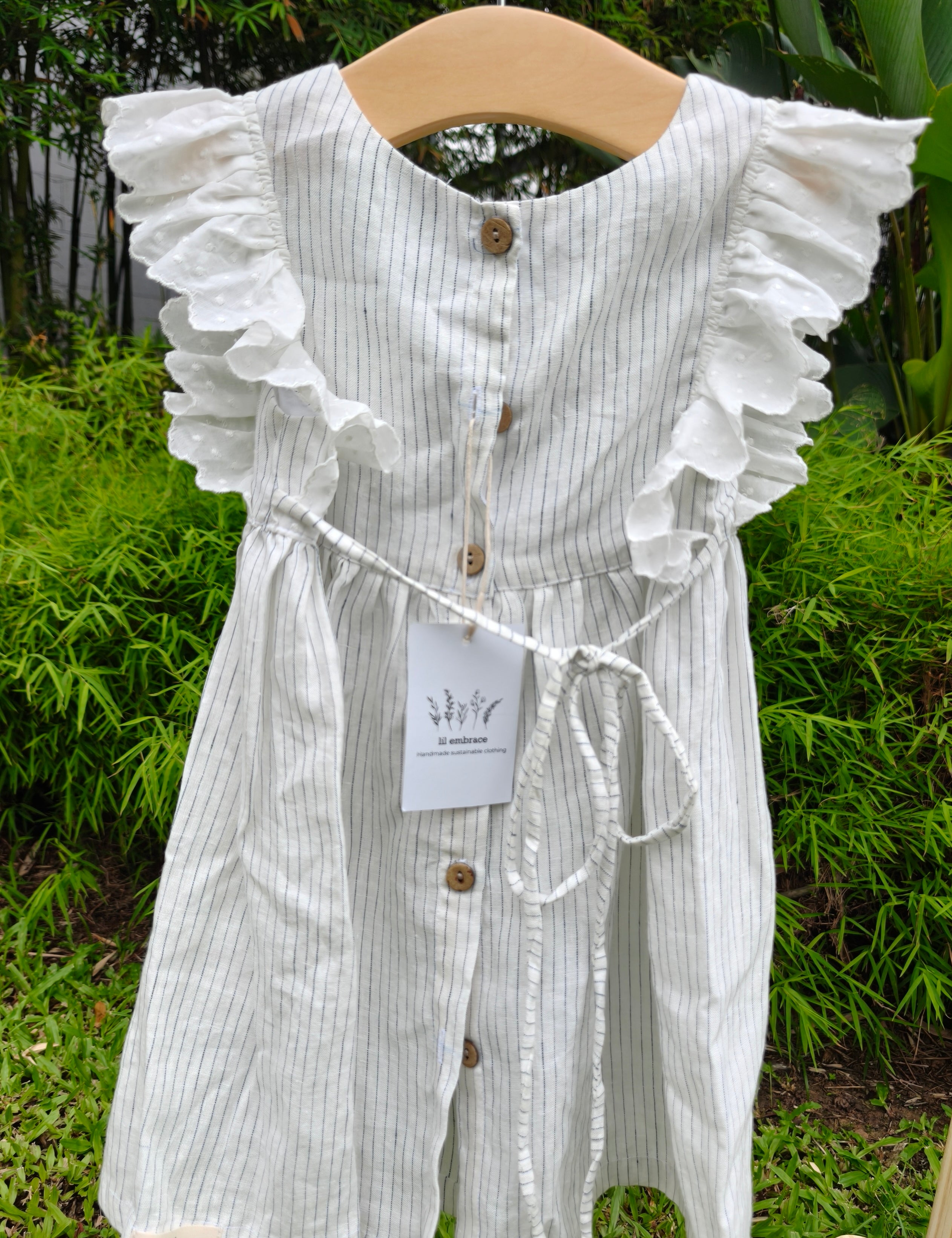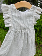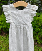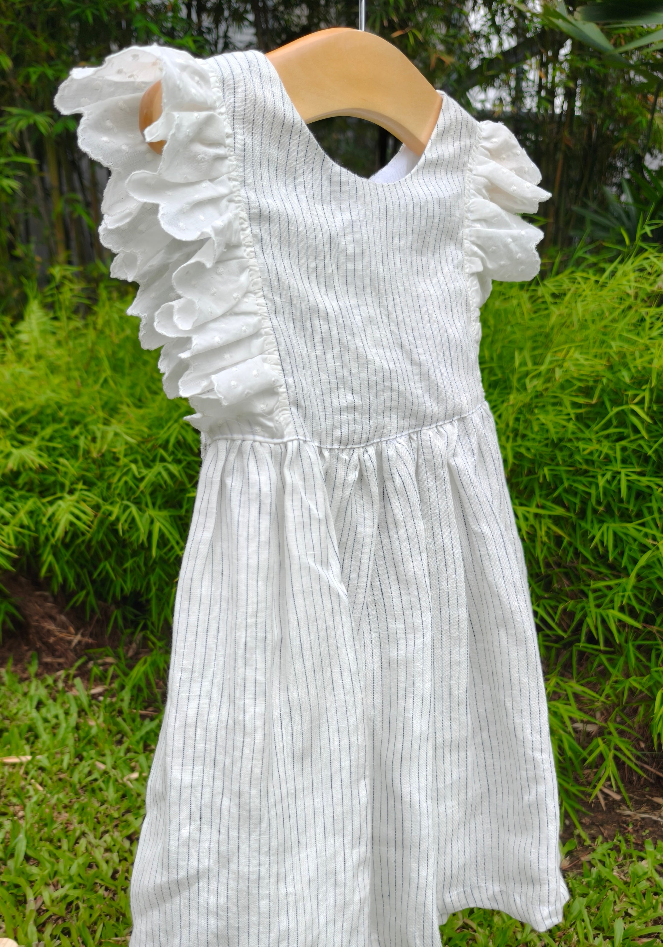 A timeless piece with subtle charm,  crafted from breathable striped linen and finished with delicate eyelet ruffles that run gracefully from shoulder to waist.
