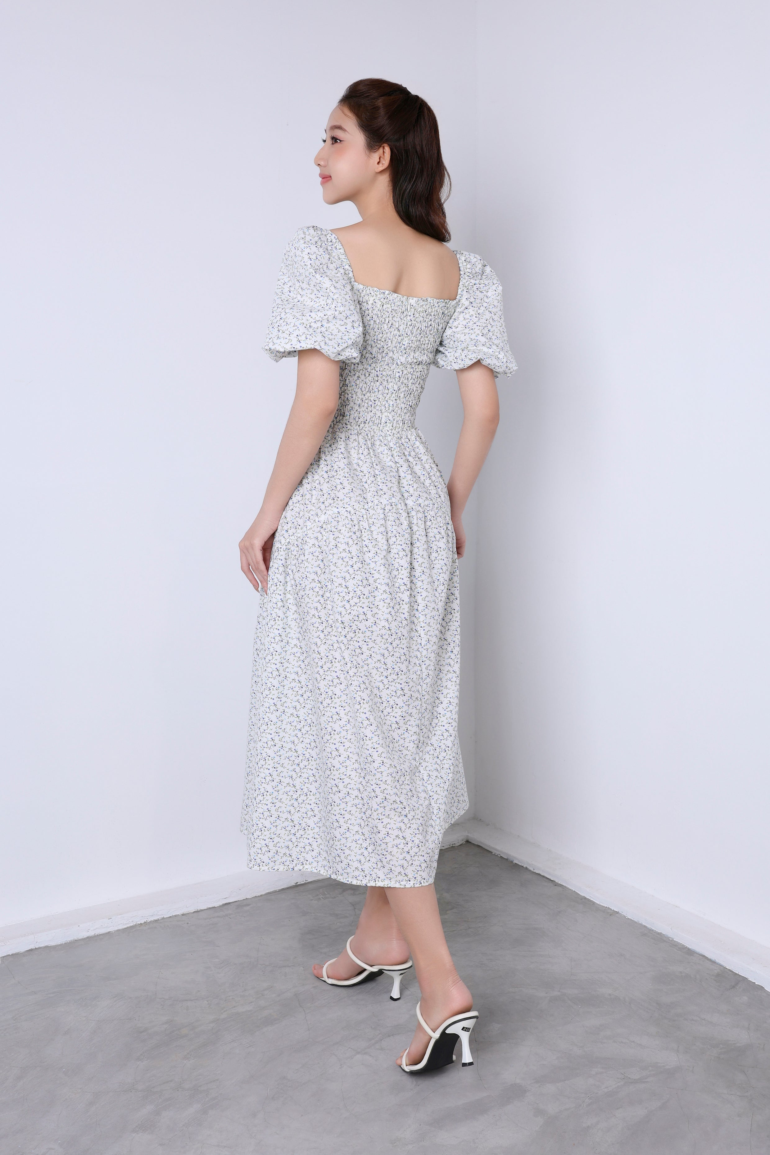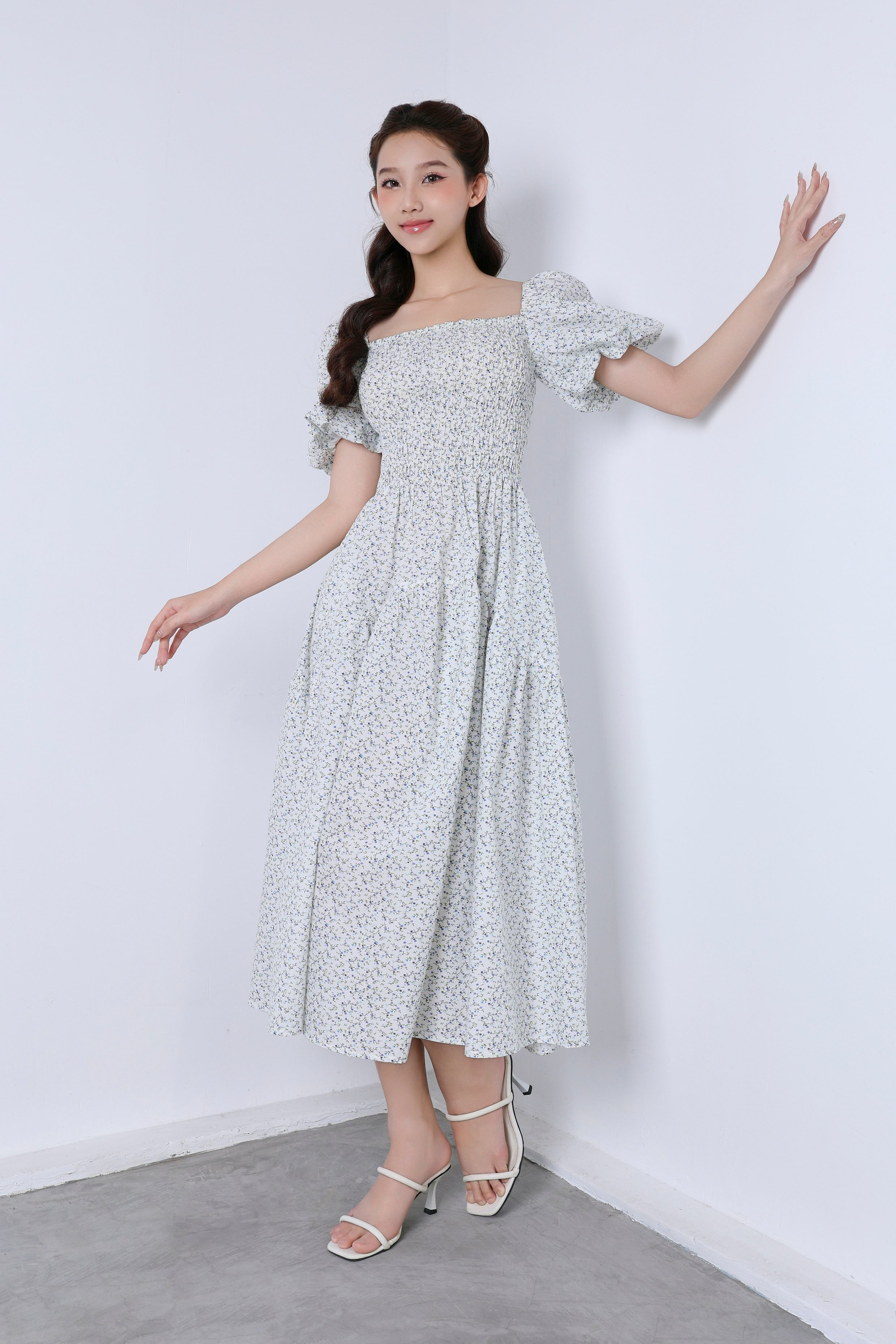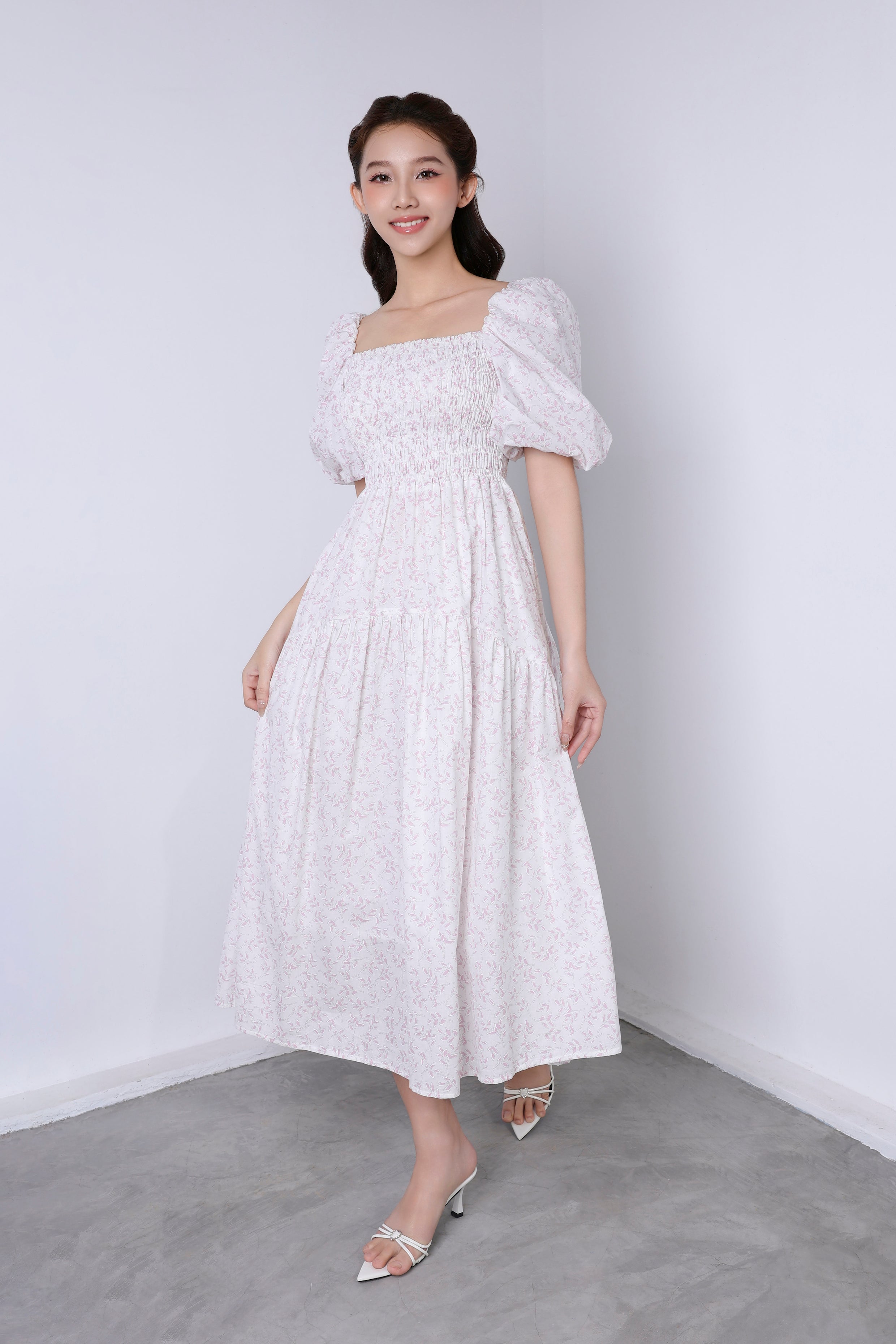 The bodice is smocked, providing a comfortable yet flattering fit, while the skirt flows gracefully, creating a soft and feminine silhouette. Paired with white strappy heels, this dress exudes a timeless, vintage-inspired elegance perfect for both casual and dressy occasions.