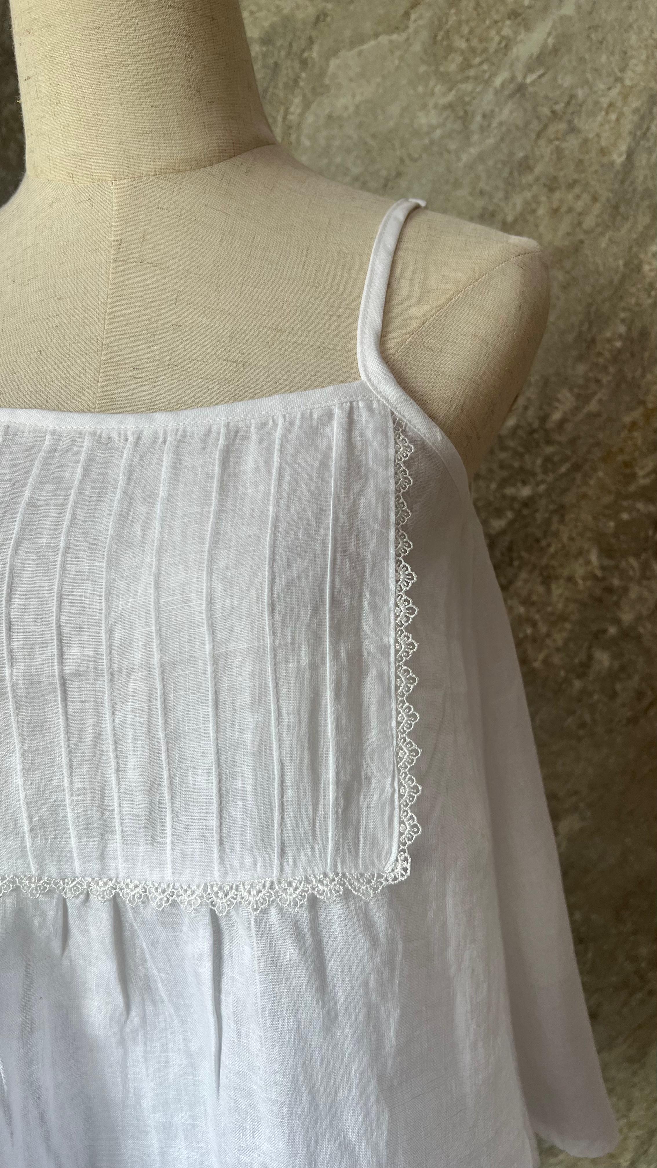 This charming top features a delicate, breezy top with thin straps and an elegant lace trim. The relaxed, A-line silhouette is complemented by subtle pintuck detailing on the bodice.